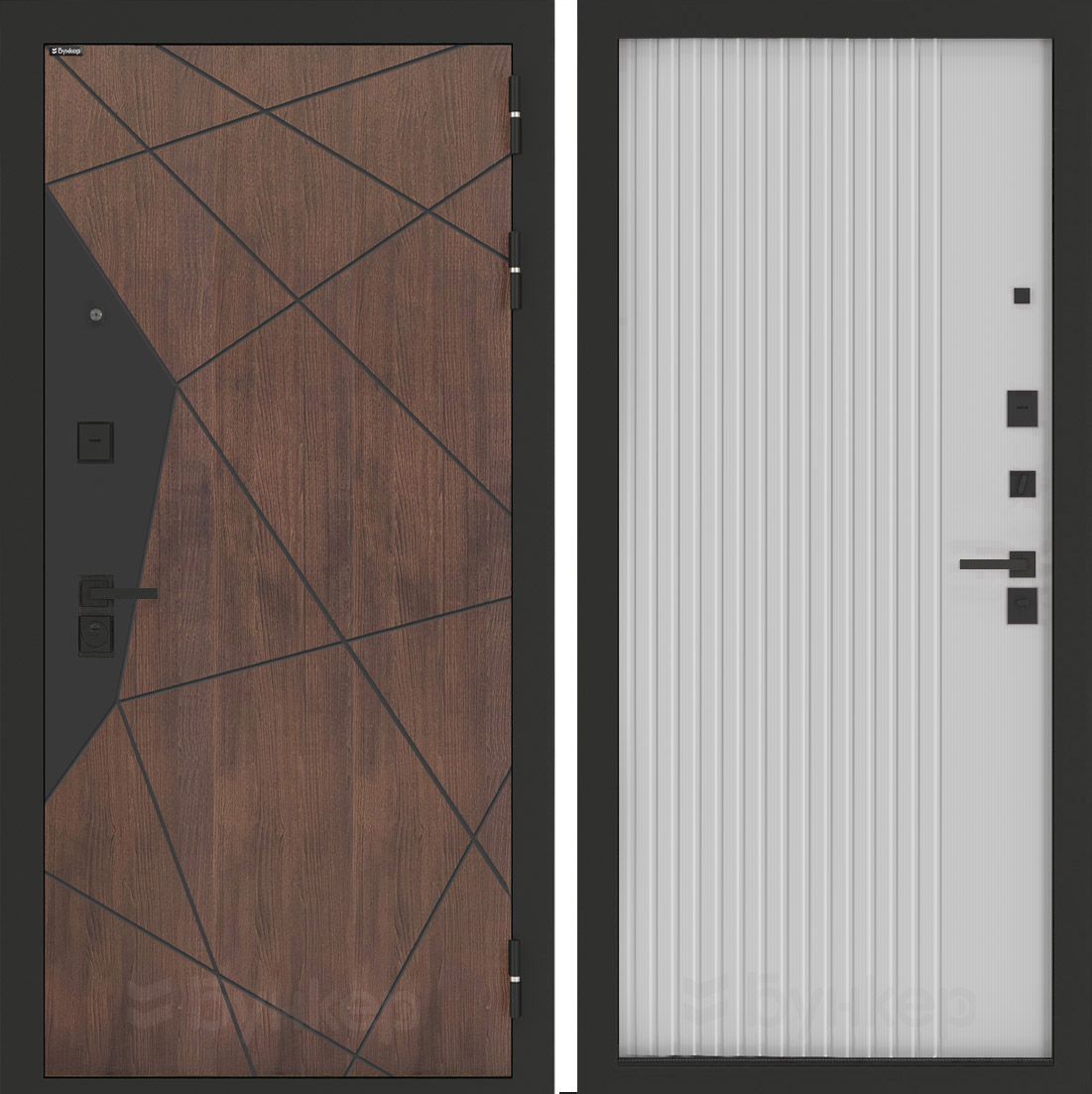 Входная дверь модели Бункер BN-14 представляет собой конструктивное решение, выполненное из древесноволокнистой плиты (ДВП) в Черный кварц. Дверной блок оснащен светлой броненакладкой, которая обеспечивает дополнительный уровень защиты. Конструкция броненакладки предусматривает наличие шторки, что позволяет регулировать уровень освещенности в проеме и обеспечивает дополнительную приватность. В комплектацию также входят глазок и дверная ручка, обеспечивающие удобство эксплуатации. Для обеспечения безопасности в ночное время предусмотрена ночная задвижка. Цилиндровый механизм с ключом-вертушкой, производитель которого не указан, обеспечивает надежное запирание. Регулируемый эксцентрик позволяет точно настроить плотность прилегания двери к раме, что способствует повышению энергоэффективности и шумоизоляции помещения.