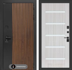 Входная дверь с терморазрывом Лабиринт Айслаб 01 — Сандал белый, стекло белое. Наличник имеет увеличенные габариты, составляя 100 мм, что обеспечивает повышенную устойчивость к механическим воздействиям. Металлические компоненты изделия подвергаются антикоррозийной обработке методом фосфатирования, что значительно продлевает срок службы изделия в условиях повышенной влажности и агрессивной среды. Финишное покрытие, выполненное в технологии "Муар" черного цвета, придает изделию эстетически привлекательный внешний вид и дополнительную защиту от внешних факторов.