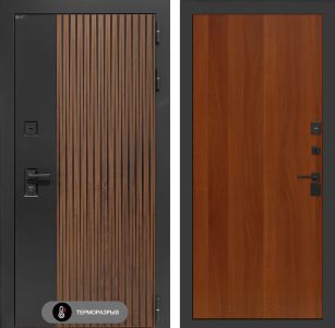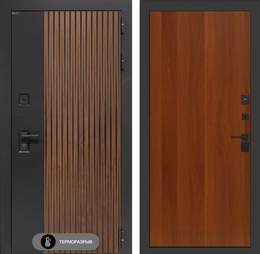 Входная дверь с терморазрывом Лабиринт Айслаб 05 – Итальянский орех . Наличник имеет увеличенные габариты, составляя 100 мм, что обеспечивает повышенную устойчивость к механическим воздействиям. Металлические компоненты изделия подвергаются антикоррозийной обработке методом фосфатирования, что значительно продлевает срок службы изделия в условиях повышенной влажности и агрессивной среды. Финишное покрытие, выполненное в технологии "Муар" черного цвета, придает изделию эстетически привлекательный внешний вид и дополнительную защиту от внешних факторов.