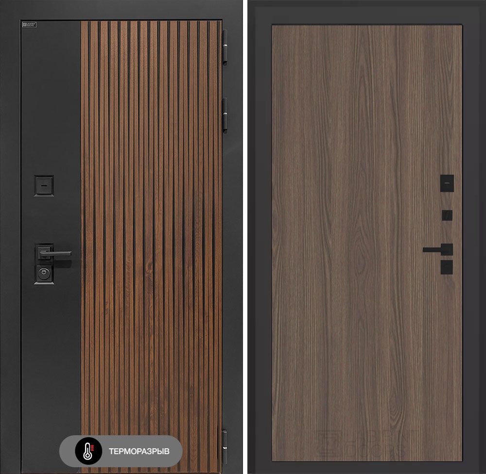 Входная дверь с терморазрывом Лабиринт Айслаб 05 – Ясень темный . Наличник имеет увеличенные габариты, составляя 100 мм, что обеспечивает повышенную устойчивость к механическим воздействиям. Металлические компоненты изделия подвергаются антикоррозийной обработке методом фосфатирования, что значительно продлевает срок службы изделия в условиях повышенной влажности и агрессивной среды. Финишное покрытие, выполненное в технологии "Муар" черного цвета, придает изделию эстетически привлекательный внешний вид и дополнительную защиту от внешних факторов.