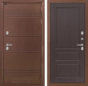 Отделка снаружи:Металлическая отделка с давлением Д44. Полимерное покрытие «Антик медный» с дополнительным цинковым грунтованием для защиты от коррозии. Фигурный наличник ФН-2