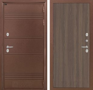 Отделка снаружи:Металлическая отделка с давлением Д44. Полимерное покрытие «Антик медный» с дополнительным цинковым грунтованием для защиты от коррозии. Фигурный наличник ФН-2