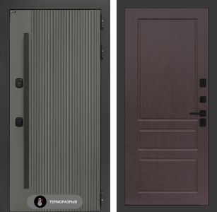 Входная дверь с терморазрывом Лабиринт Термолаб 1 тепло 03 – Орех премиум. В данной конструкции применяется ручка-скоба нажимного типа с клавишной системой активации, установленной снаружи. Наличник имеет увеличенные габариты, составляя 100 мм, что обеспечивает повышенную устойчивость к механическим воздействиям. Металлические компоненты изделия подвергаются антикоррозийной обработке методом фосфатирования, что значительно продлевает срок службы изделия в условиях повышенной влажности и агрессивной среды. Финишное покрытие, выполненное в технологии "Муар" черного цвета, придает изделию эстетически привлекательный внешний вид и дополнительную защиту от внешних факторов.