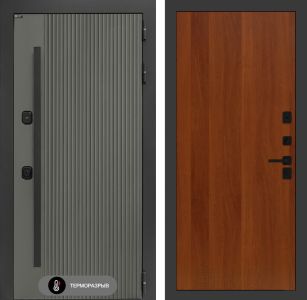 Входная дверь с терморазрывом Лабиринт Термолаб 1 тепло 05 – Итальянский орех. В данной конструкции применяется ручка-скоба нажимного типа с клавишной системой активации, установленной снаружи. Наличник имеет увеличенные габариты, составляя 100 мм, что обеспечивает повышенную устойчивость к механическим воздействиям. Металлические компоненты изделия подвергаются антикоррозийной обработке методом фосфатирования, что значительно продлевает срок службы изделия в условиях повышенной влажности и агрессивной среды. Финишное покрытие, выполненное в технологии "Муар" черного цвета, придает изделию эстетически привлекательный внешний вид и дополнительную защиту от внешних факторов.