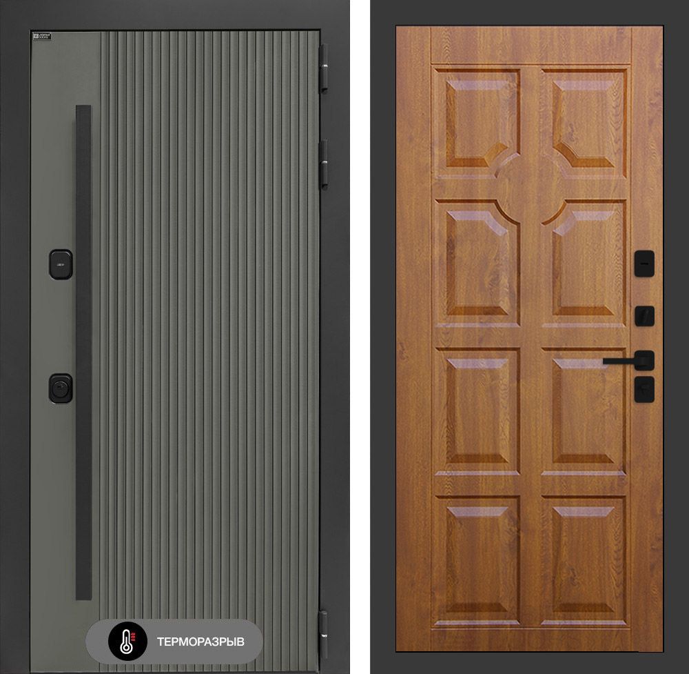 Входная дверь с терморазрывом Лабиринт Термолаб 1 тепло 17 – Золотой дуб В данной конструкции применяется ручка-скоба нажимного типа с клавишной системой активации, установленной снаружи. Наличник имеет увеличенные габариты, составляя 100 мм, что обеспечивает повышенную устойчивость к механическим воздействиям. Металлические компоненты изделия подвергаются антикоррозийной обработке методом фосфатирования, что значительно продлевает срок службы изделия в условиях повышенной влажности и агрессивной среды. Финишное покрытие, выполненное в технологии "Муар" черного цвета, придает изделию эстетически привлекательный внешний вид и дополнительную защиту от внешних факторов.