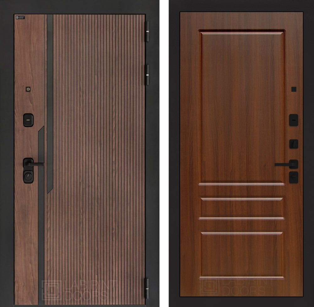 Отделка снаружи:Фрезерованная МДФ панель 10 мм, цвет "Орех американский" с патиной и вставками из металла в цвет наличника (заподлицо)