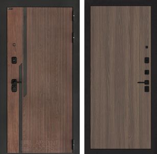 Отделка снаружи:Фрезерованная МДФ панель 10 мм, цвет "Орех американский" с патиной и вставками из металла в цвет наличника (заподлицо)