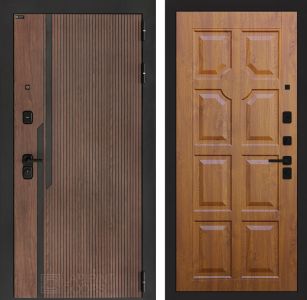 Отделка снаружи:Фрезерованная МДФ панель 10 мм, цвет "Орех американский" с патиной и вставками из металла в цвет наличника (заподлицо)