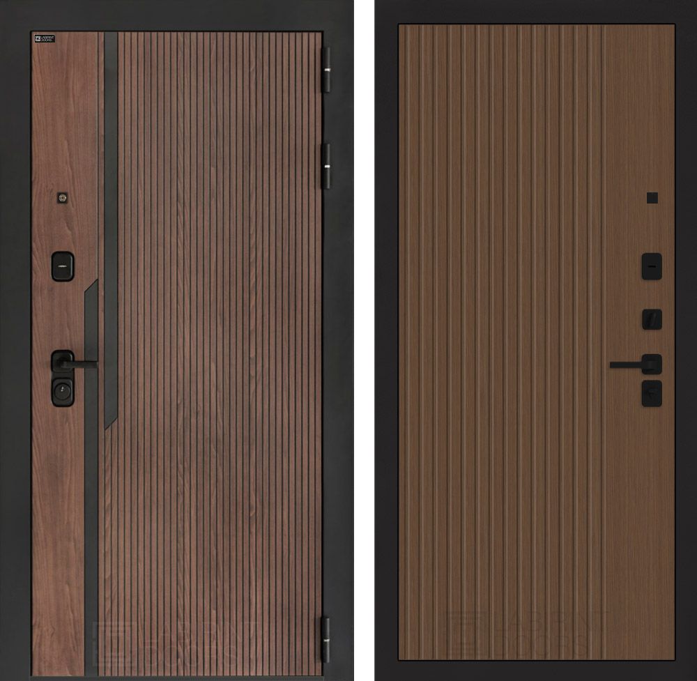 Отделка снаружи:Фрезерованная МДФ панель 10 мм, цвет "Орех американский" с патиной и вставками из металла в цвет наличника (заподлицо)