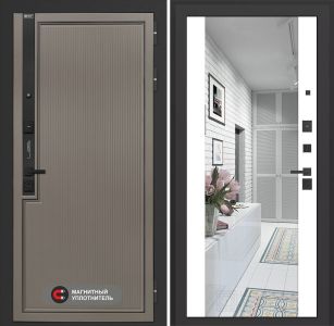 Входная дверь Лабиринт Карбон (CARBON) - Зеркало Панорама Белый софт сочетает в себе надежность и стиль. Установленная в квартиру, она имеет прочный металлический каркас толщиной 1,5 мм и утепленные ребра жесткости. Три контура уплотнения и базальтовое утепление обеспечивают отличную тепло- и звукоизоляцию. Дверь оборудована высококачественными замками KALE, а её стильная отделка с зеркалом добавит элегантности вашему интерьеру. Доставка по Москве и всем регионам РФ. Гарантия 3 года на замки, 1 год на дверь и установку.