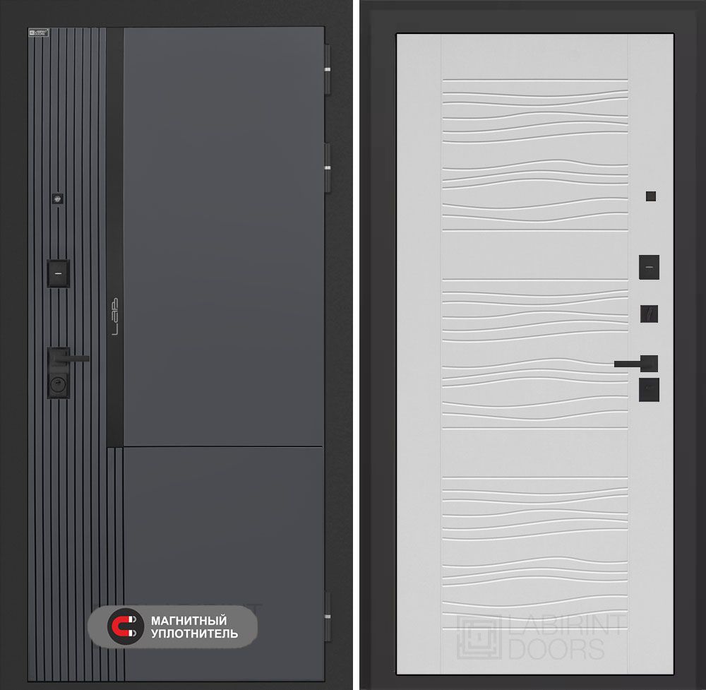 Входная дверь Лабиринт Карбон (CARBON) - Зеркало Панорама Белый софт сочетает в себе надежность и стиль. Установленная в квартиру, она имеет прочный металлический каркас толщиной 1,5 мм и утепленные ребра жесткости. Три контура уплотнения и базальтовое утепление обеспечивают отличную тепло- и звукоизоляцию. Дверь оборудована высококачественными замками KALE, а её стильная отделка с зеркалом добавит элегантности вашему интерьеру. Доставка по Москве и всем регионам РФ. Гарантия 3 года на замки, 1 год на дверь и установку.
