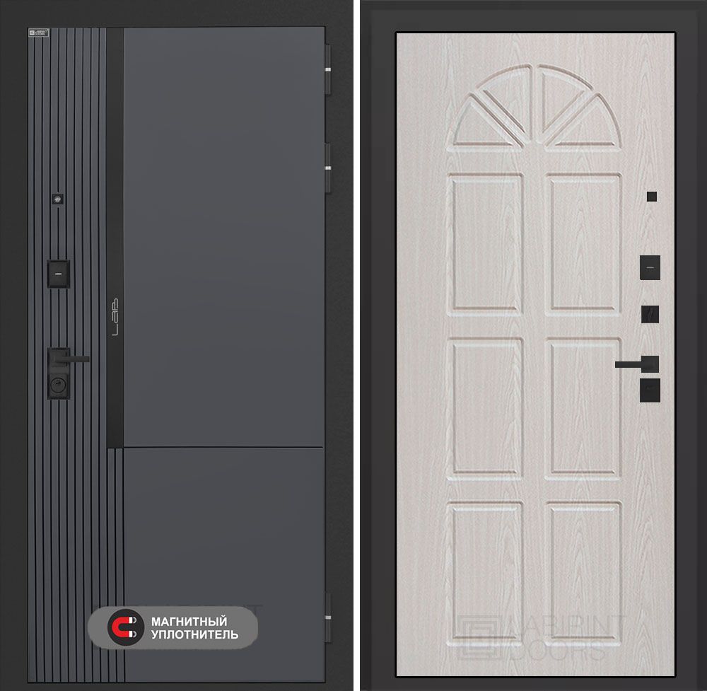 Входная дверь Лабиринт Карбон (CARBON) - Зеркало Панорама Белый софт сочетает в себе надежность и стиль. Установленная в квартиру, она имеет прочный металлический каркас толщиной 1,5 мм и утепленные ребра жесткости. Три контура уплотнения и базальтовое утепление обеспечивают отличную тепло- и звукоизоляцию. Дверь оборудована высококачественными замками KALE, а её стильная отделка с зеркалом добавит элегантности вашему интерьеру. Доставка по Москве и всем регионам РФ. Гарантия 3 года на замки, 1 год на дверь и установку.