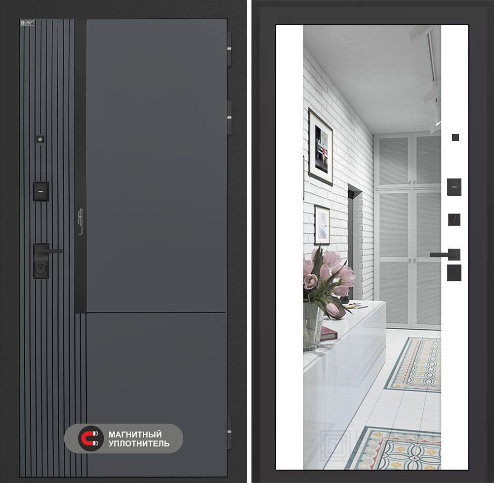 Входная дверь Лабиринт Карбон (CARBON) - Зеркало Панорама Белый софт сочетает в себе надежность и стиль. Установленная в квартиру, она имеет прочный металлический каркас толщиной 1,5 мм и утепленные ребра жесткости. Три контура уплотнения и базальтовое утепление обеспечивают отличную тепло- и звукоизоляцию. Дверь оборудована высококачественными замками KALE, а её стильная отделка с зеркалом добавит элегантности вашему интерьеру. Доставка по Москве и всем регионам РФ. Гарантия 3 года на замки, 1 год на дверь и установку.