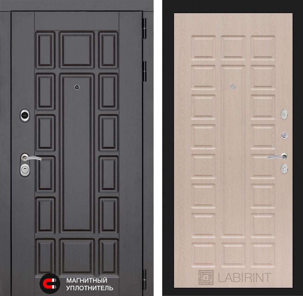Входная дверь Лабиринт Нью-Йорк 02 в цвете "Сандал белый" с черным стеклом – идеальный выбор для квартиры или офиса. Толщина металла 1,8 мм обеспечивает надежную защиту, а 3 контура уплотнения гарантируют тепло и тишину. Утеплённое полотно и короб с базальтовой плитой добавляют комфорт. Инновационные замки Kale 252 и KALE 447L обеспечивают высокий уровень безопасности. Элегантный дизайн с MDF панелями и скрытыми петлями придаёт утончённый вид. Заказывайте доставку по Москве и регионам РФ с гарантией 1 год на установку и 3 года на замки!