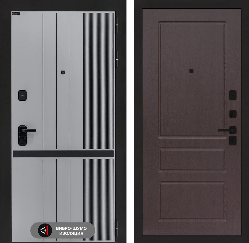 Отделка снаружи:Фрезерованная МДФ панель 10 мм, цвет "Velluto Grigio" с патиной и вставкой из металла в цвет наличника (заподлицо)